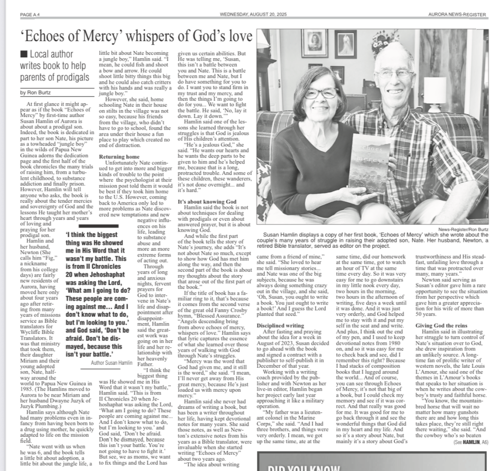 Echoes of Mercy: Testimony of a Prodigal’s Mom (Illumify Media, April 2025) In this 150-page memoir, Susan shares the raw grace of supporting her son Nate through homelessness and silence, proving God’s mercy echoes in everyday trials. Ideal for parents of prodigals or anyone questioning faith amid trouble, it answers: Does God speak? Can I trust Him? Where do I look in the storm?